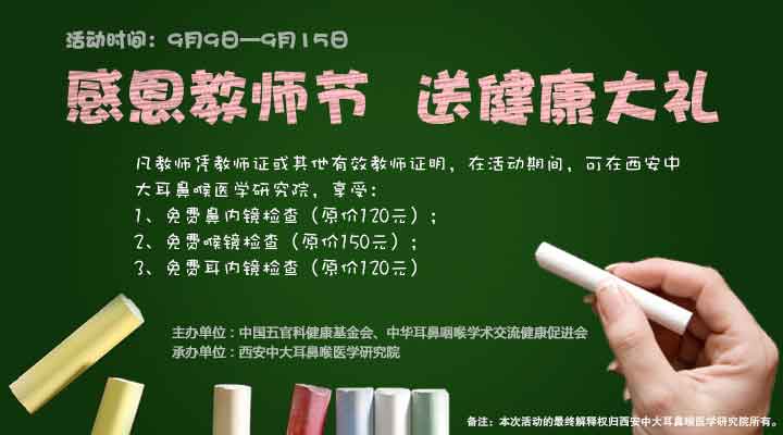 活动期间凭教师证或其他有效教师证明,在西安中大耳鼻喉医院可免费享受原价150元的喉镜检查、原价120元的鼻内镜检查以及原价120元的耳内镜检查。