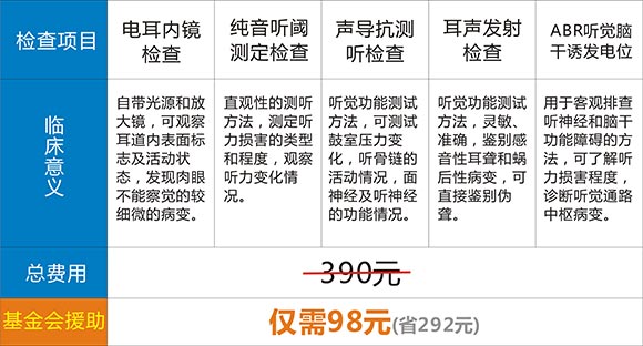 此次活动由中国五官科健康基金会对耳部疾病的人群进行基金援助,丹麦听力全套检查(电耳内镜检查、纯音听阀测定检查、声导抗测听检查、耳声发射检查、ABR听觉脑干诱发电位检查)一共390元,申请参与活动成功后,只需98元即可享受专业全面的耳鼻喉检查。