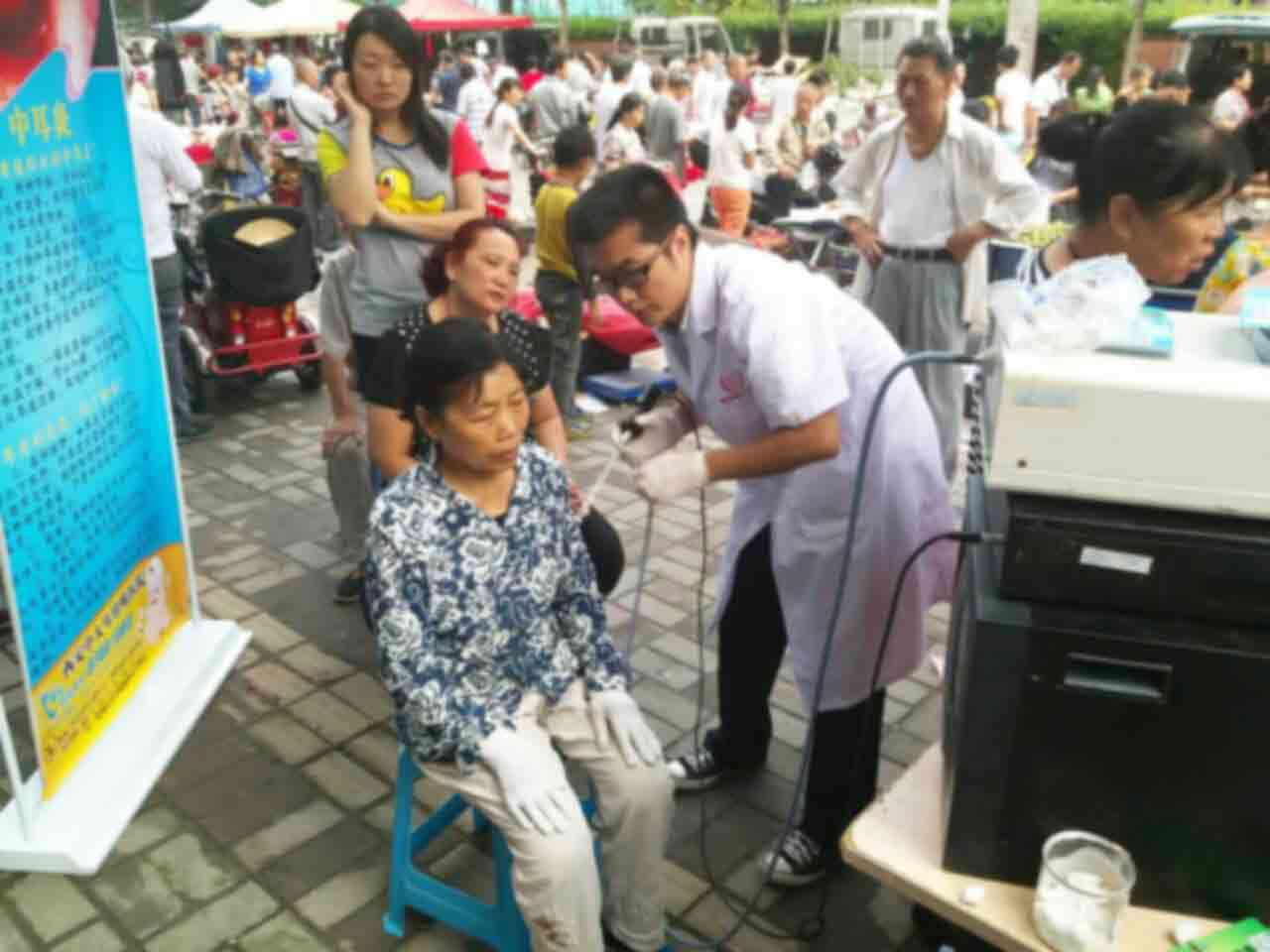 9月5日上午,西安市新城区八府庄北路这边十分热闹,在西安中大耳鼻喉医院组织的义诊点前,居民们都围在了一起。张女士拿到了免费测耳内窥镜检查的结果后,很担心的咨询着医生,中大医护人员详细了解了她的病情,指出了中耳炎的危害和并发症,中大医护人员建议她到中大做进一步的诊断。