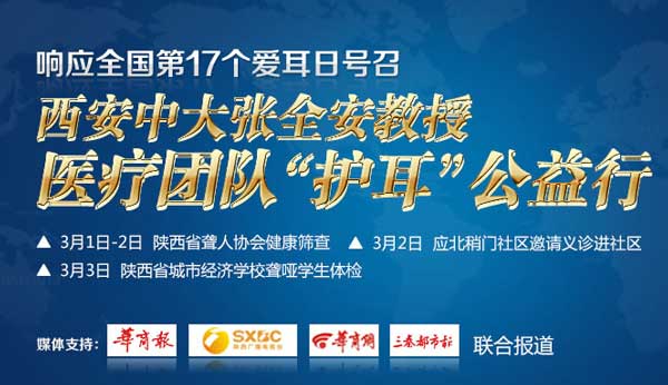 您和家人听力健康吗?您知道什么疾病会导致听力下降吗?当家人出现声音反应迟钝,您是否知道要进行听力问题排查吗?日常生活中该如何爱护我们的耳朵呢?据悉,为响应我国第17个“爱耳日”号召 ,提高广大西安市民对耳朵的关爱,增强防治意识,做到早检查、早诊治,中国五官健康基金会联合西安中大耳鼻喉医院全面开展【全国爱耳日公益健康筛查活动】,以耳鼻喉学科带头人张全安教授为首的医疗团队开展“护耳”公益行系列活动。