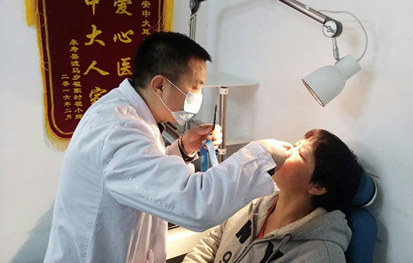 西安中大耳鼻喉医院马祥德主任正在为聋人朋友检查